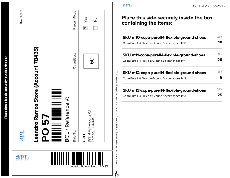 The layout for Parcel Shipping Plan labels, automatically configures the required labels based on the Shipping Plan’s packing setup by adding the total quantity of items within each box and marking them as Parcel Mixed when in a multiple box configuration, helping to streamline the receiving process at the warehouse.