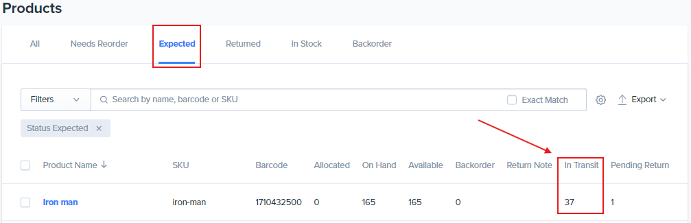 - In Transit: The total count of an SKU that has been ordered from a vendor (also referred to as a supplier).