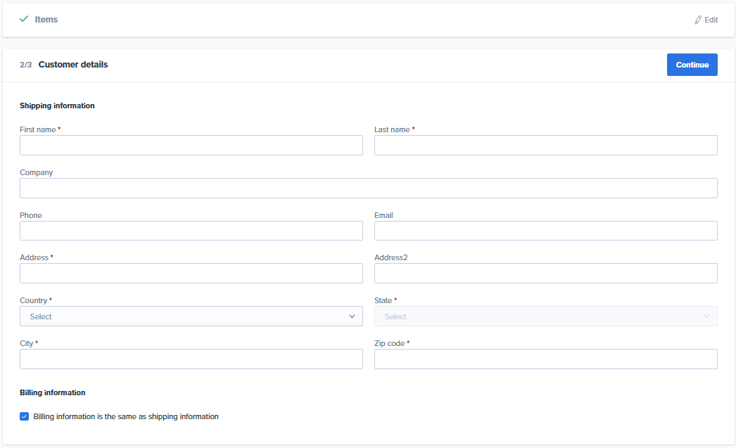 Next add your customer details. This will include the shipping information such as first and last name and shipping address.