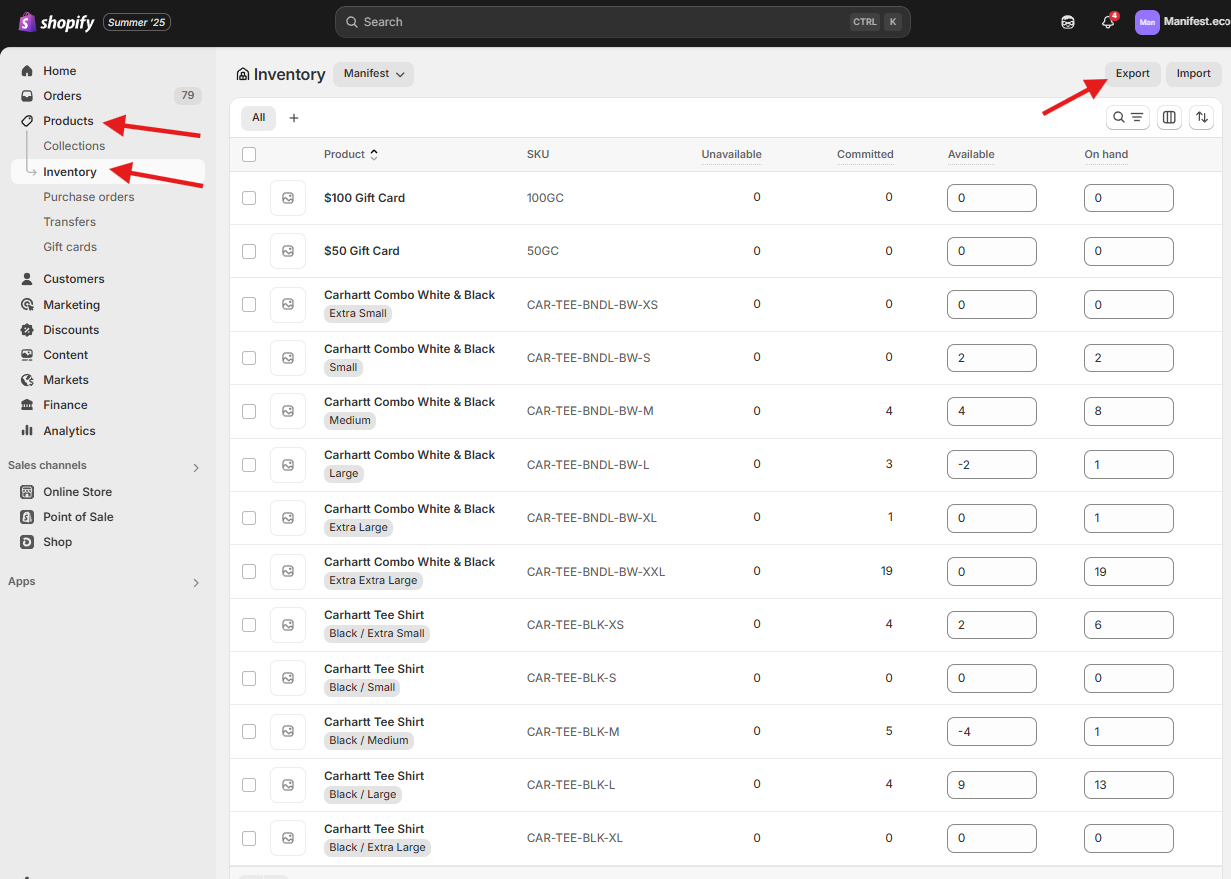 - On the Merchant's Shopify, you will go to Products > Inventory and then select Export