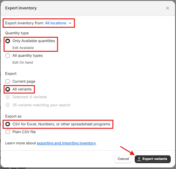 - On the Export Inventory page, make sure the following selections are made and then select Export Variants