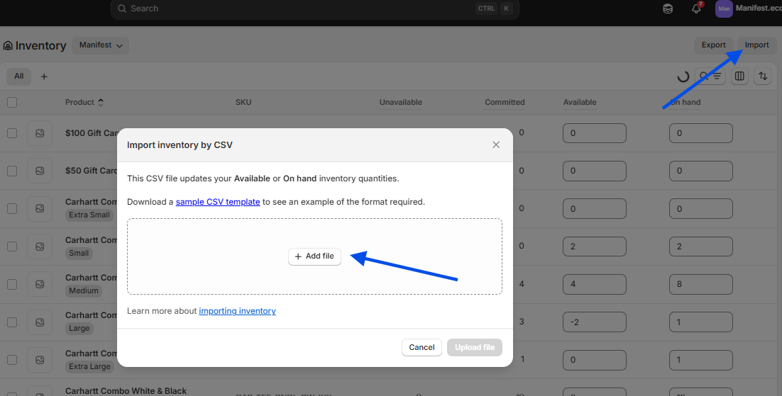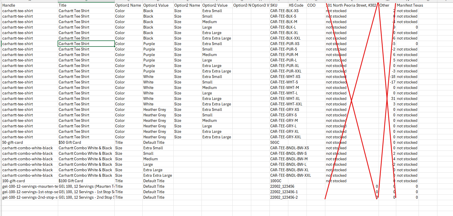 - Once completed, you will save this file as a CSV and import into Shopify by going to Products > Inventory and then select Import. Then select your saved CSV.