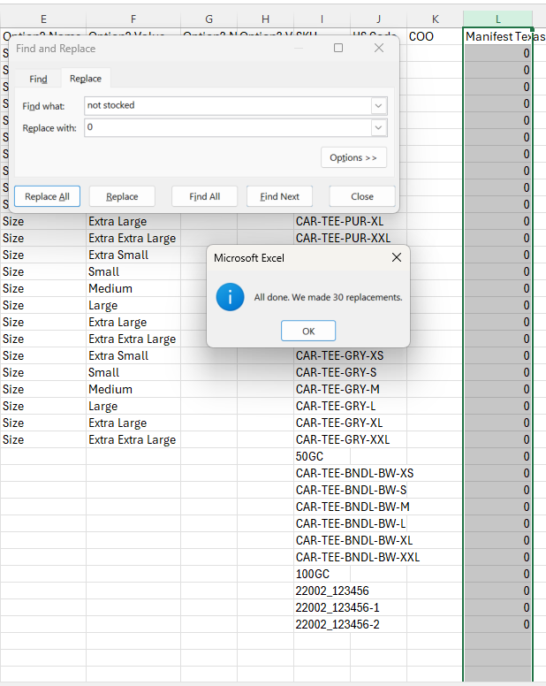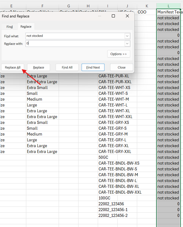 - Then you will Find & Replace all "not stocked" cells with the value "0". This is the step that will activate the location for the product.