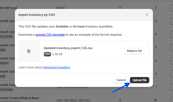 - You will then click Upload file to activate the location for the desired products