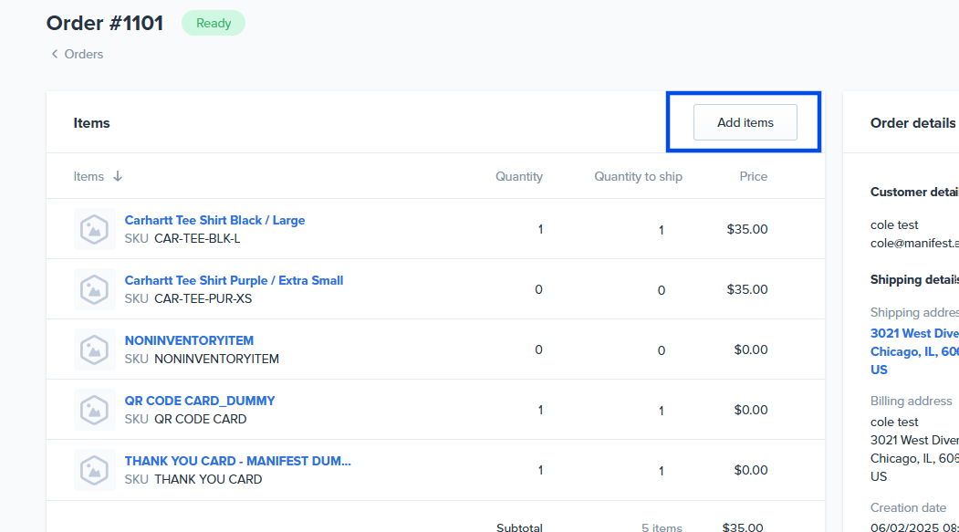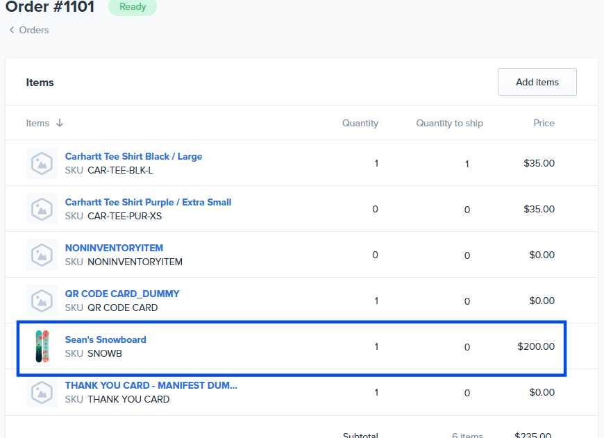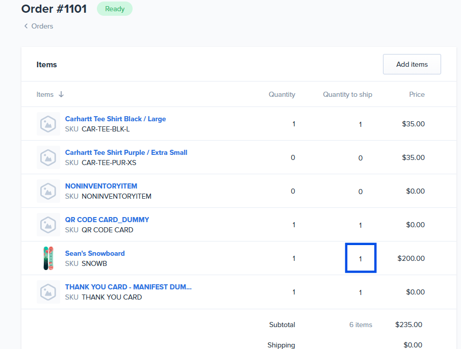 - Once selected you will receive a confirmation message at the top of your screen and the product will be listed as a line item and you can modify the Quantity to Ship