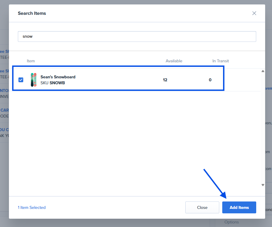 A pop up will then appear where you can search for and add the product. Once selected you will click Add items
