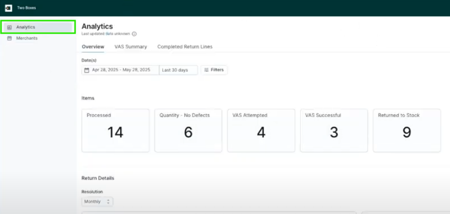 The Analytics section in Two Boxes provides clear visibility into return trends and warehouse performance. It allows you to monitor return volume over time. You'll also gain insight into how returned items are being handled, the VAS applied to each returns, and track how quickly returns move through the system from receipt to final disposition. This data helps brands make informed, data-driven decisions to improve their post-purchase experience and reduce avoidable returns. Below provides insights into the various Analytics page sections in Two Boxes-