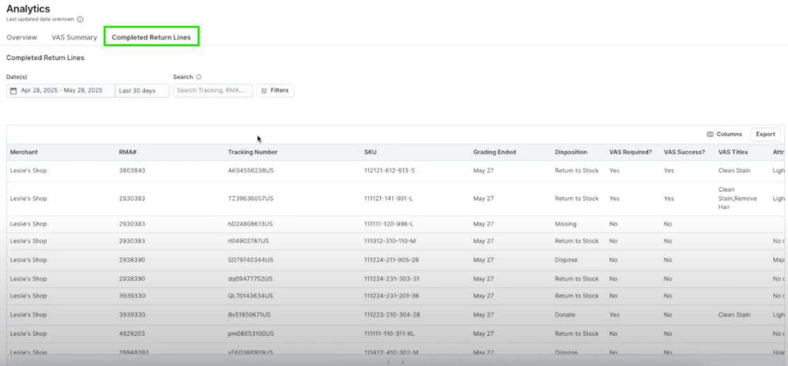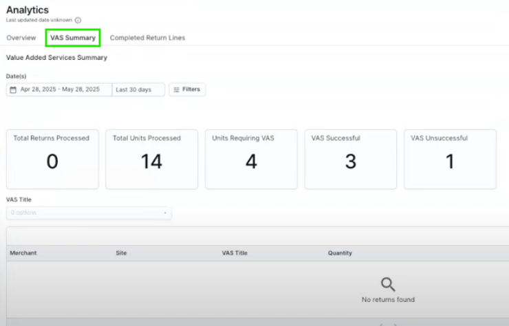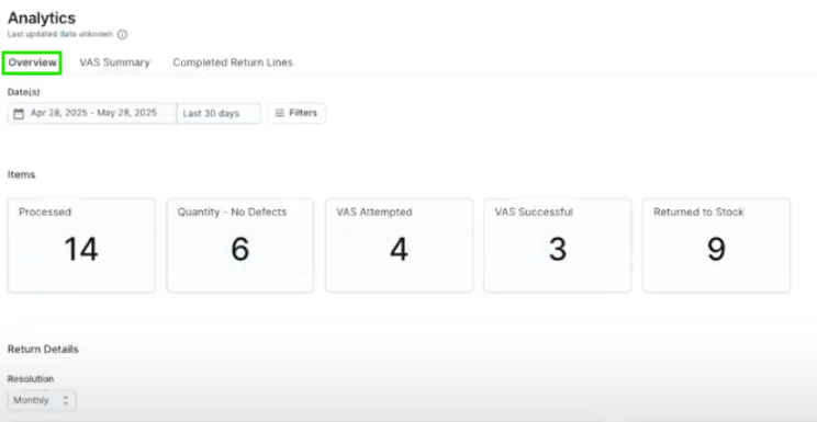- Select the Analytics page where there are 3 options: Overview, VAS Summary, and Completed Return Lines