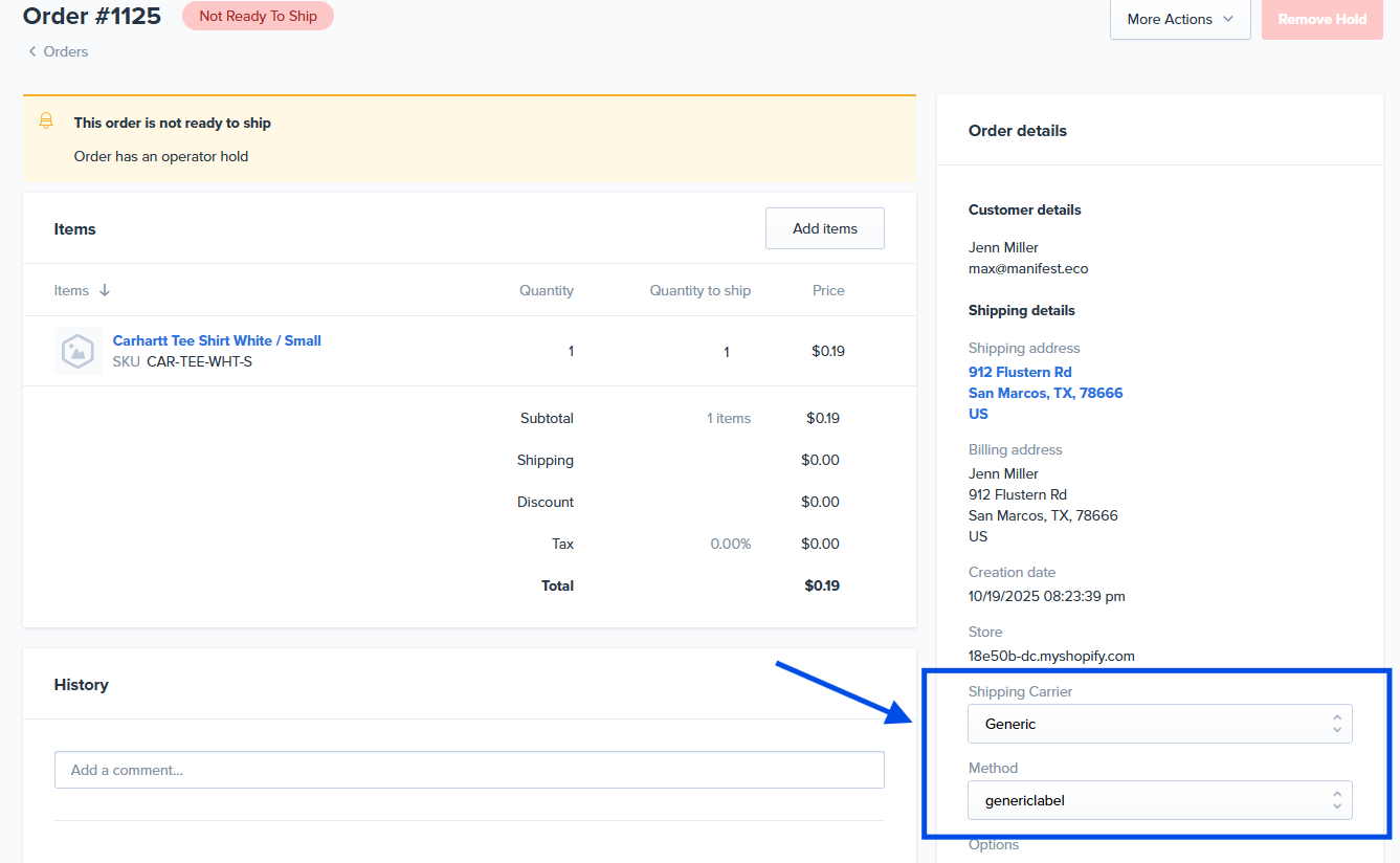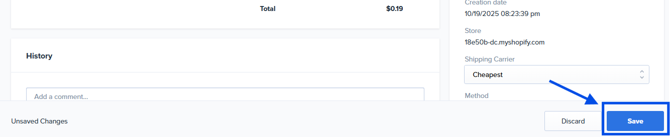 - On the order page, you will go to the right-hand side under Order details and update the shipping option you would like to use. Then click Save